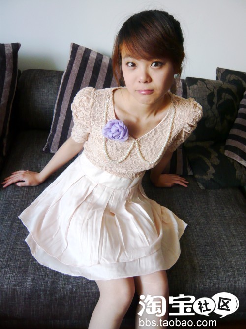 这款裙子给人的第一印象就是淑女风格,成熟稳重中不失甜美哦,公主袖,珍珠领,配上胸口的胸花,真的很像小礼服呢
