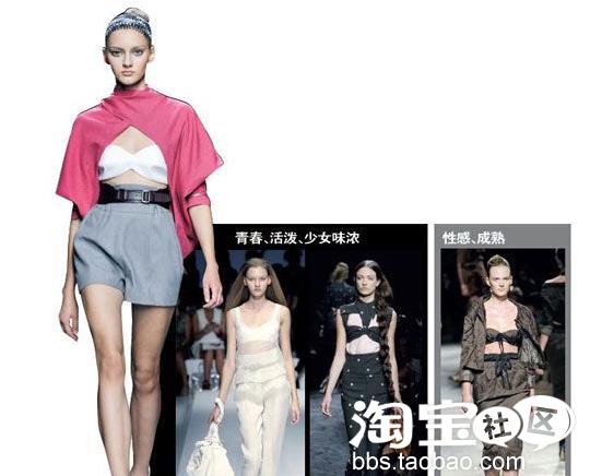 ●比基尼与低腰牛仔裤的搭配属于“小甜甜”之类的“辣妹”,这一季大热的形象是款式略带保守的内衣与高腰裤/裙的搭配,就像是Miu Miu、YSL在T台上的演绎一样,同时,别忘记加个小披肩,才能完成整体造型。