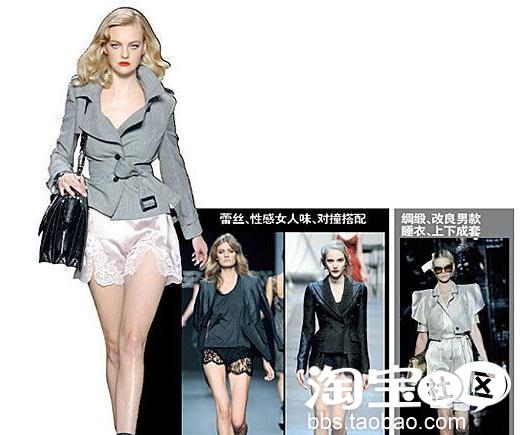 蕾丝镶边的丝缎睡衣,听起来很诱人,但似乎只限于穿在屋里?不,那已经是过去的老皇历啦!如今,你只需要直接在上面套件西装外套,就能肆无忌惮地将它们穿出家门,这便是John Galliano在这一季的Dior秀场上为我们带来的新的搭配方案。尽管看似有些突兀,但正因为强烈的对比感,才有种出其不意的效果。并且,这个举动毫无疑问是值得赞赏的,至少,它比Lady Gaga的旱地泳装更易穿,更有女人味,比上个春夏季Dolce&Gabbana的改良版男性睡衣更性感,也更具实穿的合理性。