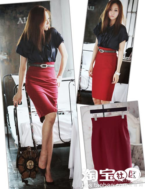 修身的酒红色半裙与黑色罩衫搭配起来十分亮眼,大方端庄之余增添更多女人味。修身外形结合弹力材质自然修饰腰部及臀部线条,挑选一对黑色高跟鞋再合适不过了。