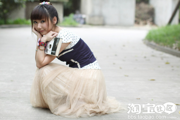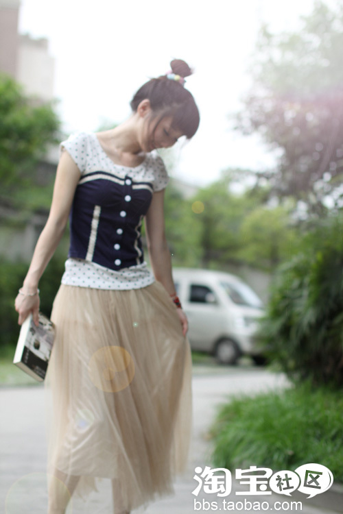 白色棉布水手上衣+蓬蓬公主裙+黑色宽腰封+黑色高跟丁鞋=性感清纯大公主。学院风潮永吹不熄,我们是她永远的追随者,那个青春懵懂的年代,那张伤痕累累的书桌,还有那辆锈迹斑斑却承载着我们甜蜜笑声的自行车。我们长大了,但是我们不会忘却。