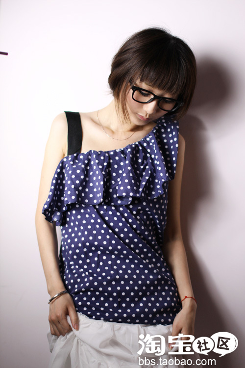 单肩波点荷叶边吊带衣+白色雪纺长裙=优雅知性大公主。百变就是我们的姿态,我们拥有风格各异的每一天,试着走入我们的世界来感受。