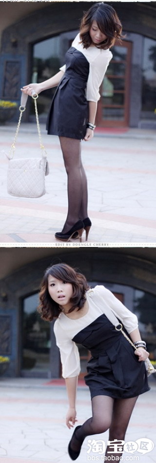 看上去很像是两件,其实就是一件,黑色的抹胸裙加上了米白色的雪纺。