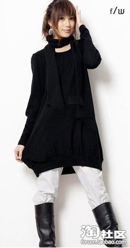 利用紧身裤袜来掩盖粗壮大腿,其次利用同色长靴增加修型效果,同时增长下半身,上身选择长款上衣遮盖一部分臀部