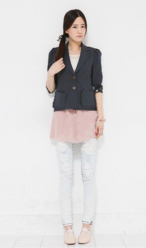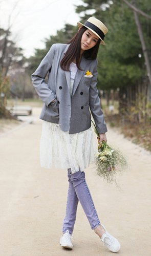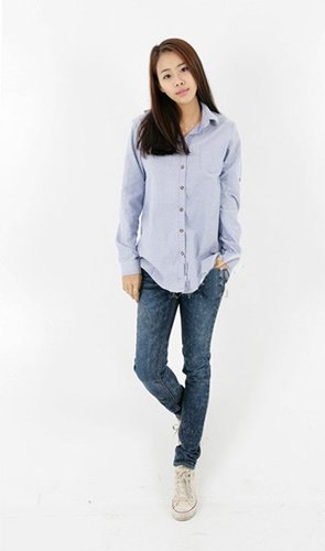 这个给人比较中性的感觉,但我想也是很多MM喜欢的款吧。在宽松的蓝色衬衫的衬托下,更显出了女孩子的纤细柔美,搭上这款铅笔裤显得干净利落。旧旧的帆布鞋也比较有味道哦!O(∩_∩)O~