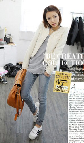 超喜欢这种感觉,这种神色破洞牛仔裤和黑色高帮鞋是MM们必备的,加上件亮色的上衣,那种青春 休闲运动的感觉就出来喽!!