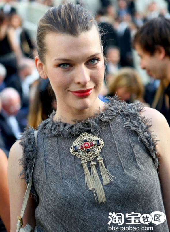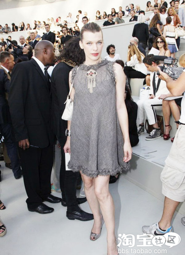 Chanel 2010-11高级定制秀场场外:超模兼演员 Milla Jovovich 身着CHANEL 秋冬高级成衣Starting Point系列连衣裙。