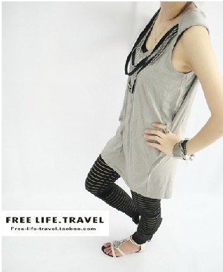 浅色紧身裤搭配黑色宽松露肩上衣,复古中透着小性感。