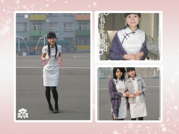班里演一个英文话剧时我穿上了这件旗袍,再配个蝴蝶流苏耳环,很古典的样子~照片中宿舍的孩子在帮我梳头发,