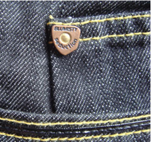 BLUMISTY是韩国专做牛仔的新潮时尚品牌,个性裁剪。在我们国内没有什么名气,造假者决不会费钱费力去开模做专用纽扣,所以根据纽扣这一个细节就可以确定这款服装是货真价实的外贸服装。还有拉链,大家拿出自己买的大牌的衣衣,看看拉链的做工,精细程度,也能看出一些情况来,有的还是匹配固定品牌的拉链,但是大品牌因为恐惧“盗版”,会严格控制原料进出。如前文所述,下单后,国外公司对于纽扣、拉链、吊牌等辅料的控制是比较严格的,因为一个萝卜一个坑,辅料的数量是可以计算出来的,多也不可能多到哪里去,不像面料是无法准确计算出用量。做完订单后,制衣厂通常面料有剩,扣子、拉链用光了。这是,就有厂家“废物利用”,用多余的原装面料,再随便找些辅料根据原来的版型做一批衣服。这批衣服尽管辅料不一样,但面料都是原装的,也是外贸中不可多得的“极品”。
