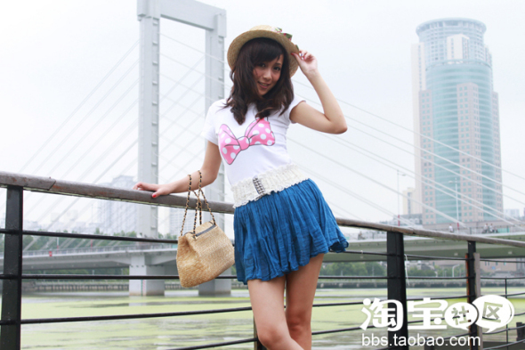 蝴蝶结白色可爱T恤和海蓝色的褶皱裙搭配,尽显可爱!