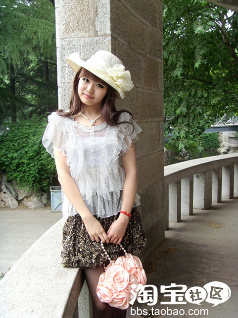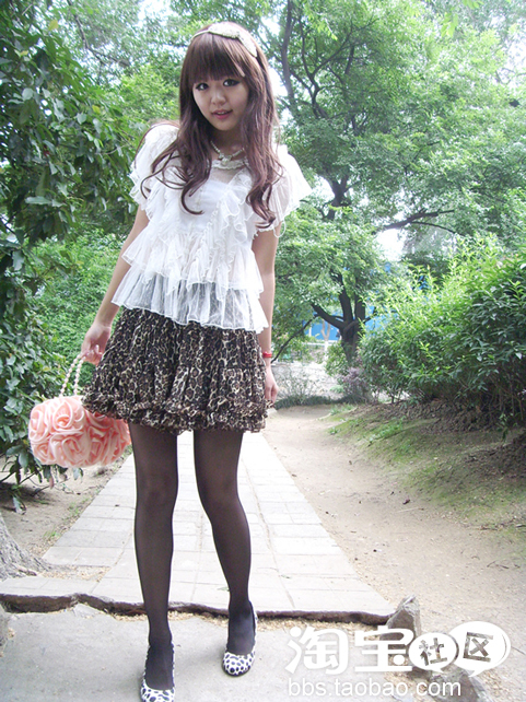 仙女蕾丝衫透明纱+豹纹雪纺短裙 +黑色高跟鞋,打造贝儿公主风。