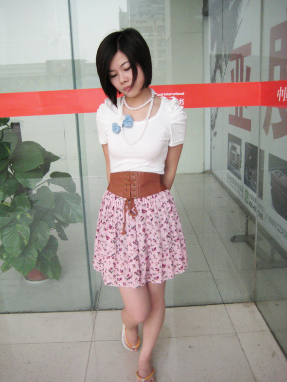 小碎花裙+简单T恤+宽百搭腰带=日系复古淑女公主