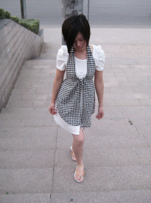 黑白格子挂脖假两件+泡泡袖打底T=清爽休闲公主