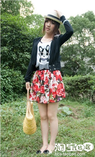 6. 复古写意玫瑰防走光内胆雪纺短裙三件套:很时尚休闲的一套搭配,花色短裙写意图案颜色亮丽,尽显复古时尚,百搭动物图案T恤,外搭针织小外套,绝美的三件套搭配;设计非常人性化,一般的YY没有哦,短裙里面的衬裤100%防止走光,让你动感十足。!