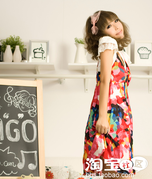 粉粉的雪纺+蕾丝边+深粉的蝴蝶结印花