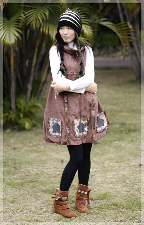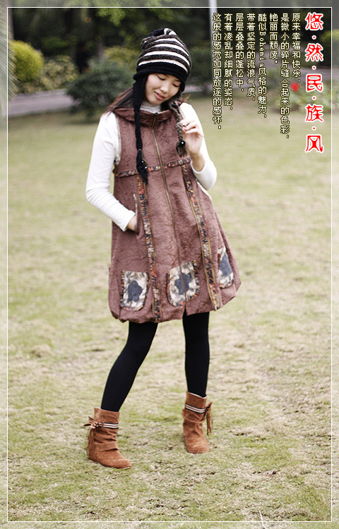 D、民族风背心连衣裙+毛线编织帽+白色打底衫+黑色打底裤+沙皮短靴