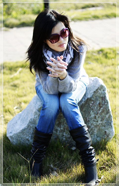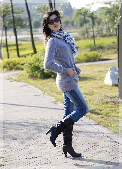 C、兔毛长毛衣+磨白牛仔裤+灰色骷髅围巾+黑色高筒靴