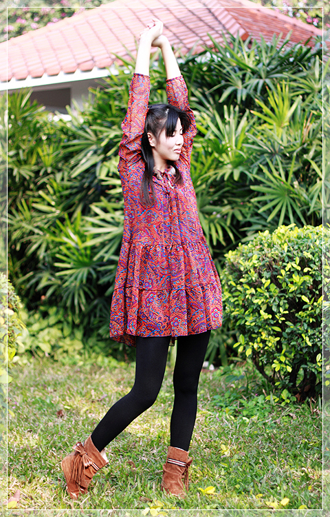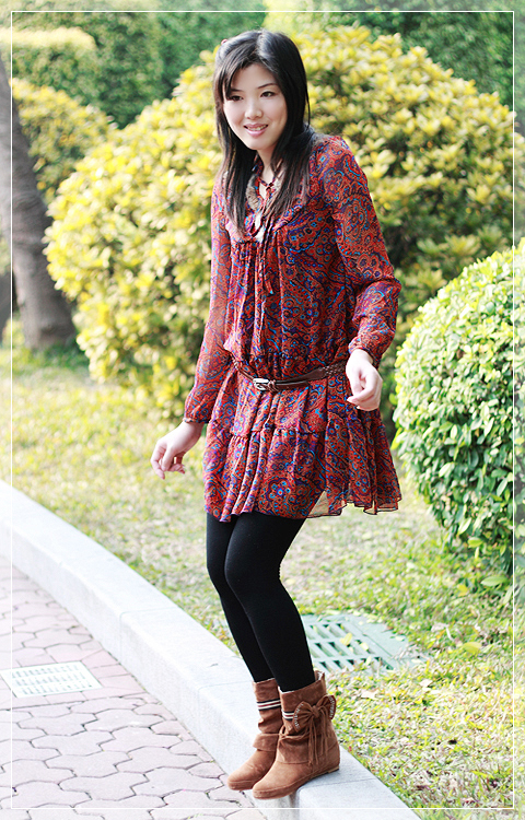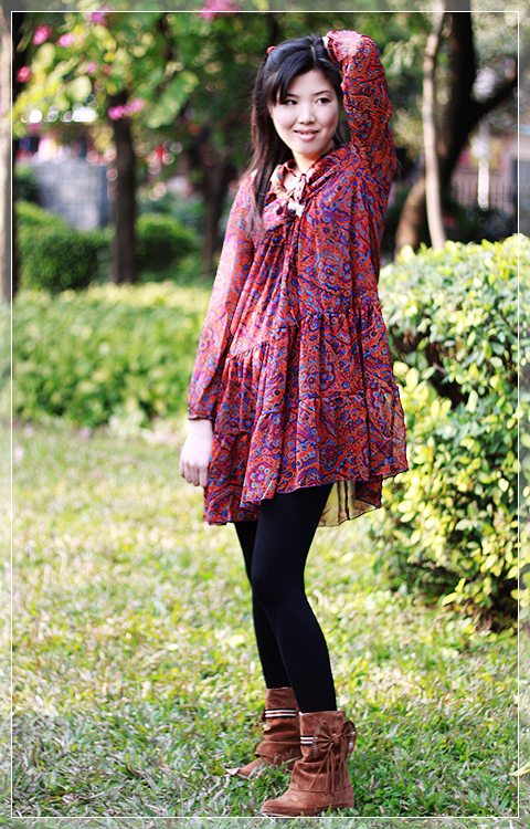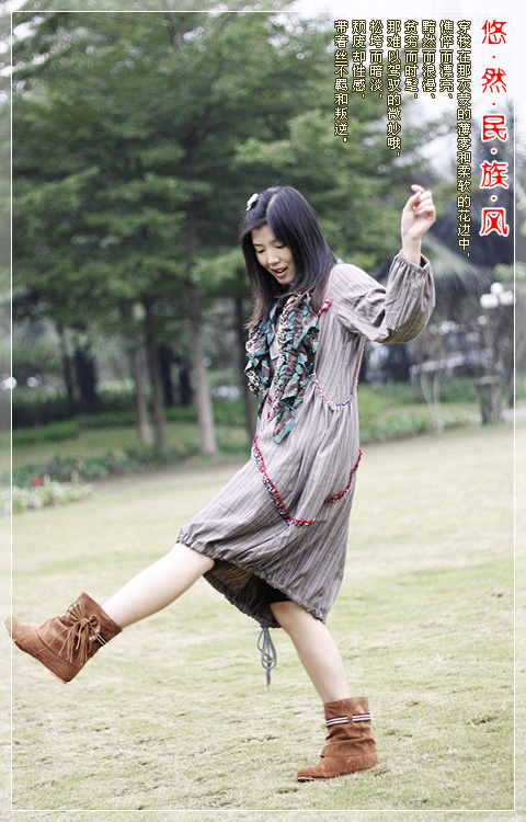 C、民族风花边连衣裙+沙皮短靴+红色麻织腰带