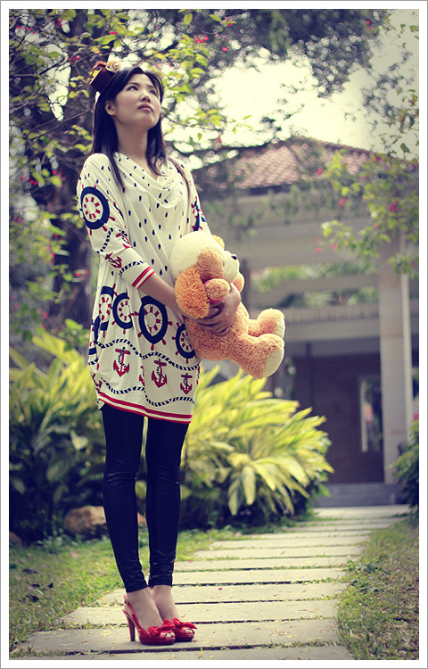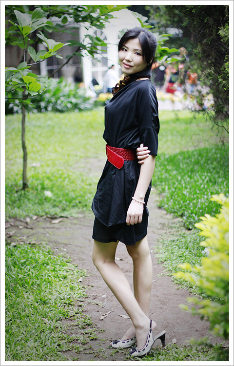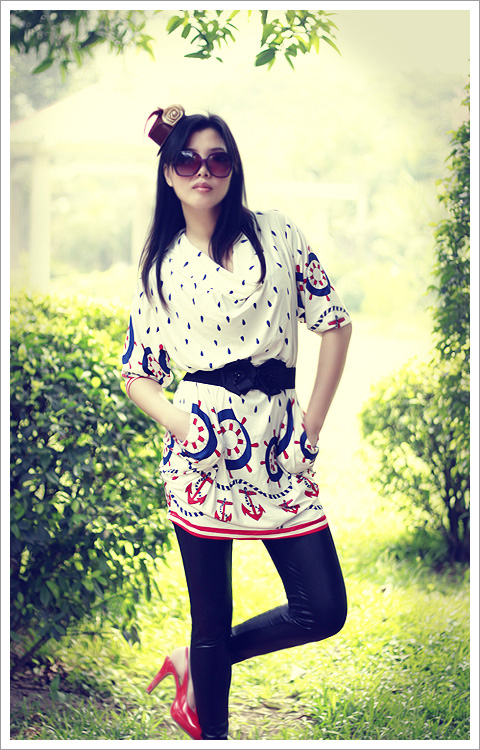 B、冰柔丝船锚T裙+日本原单皮革打底裤+红色高跟凉鞋+黑色弹力腰带+咖啡色小帽子发卡