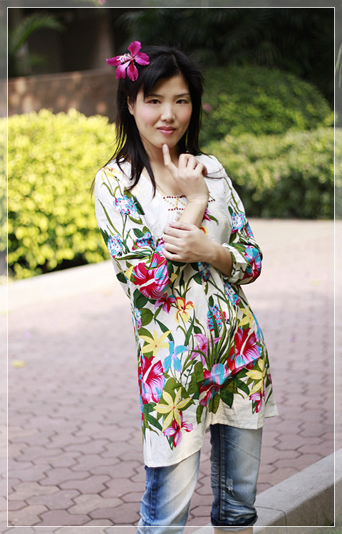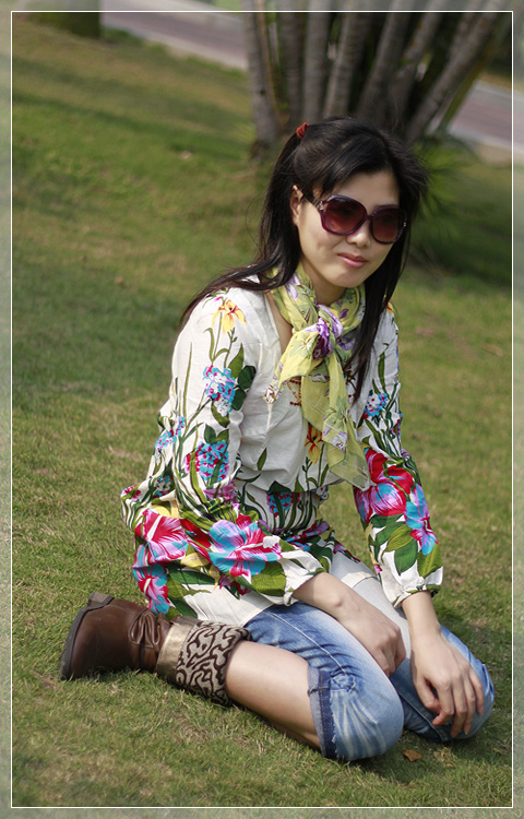 F、民族风大花衬衫+磨白牛仔裤+复古包跟皮鞋+大花围巾