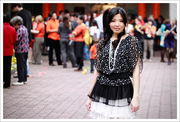 A、黑色雪纺衫+白色纱裙+白色羊皮凉鞋+黑色麻织腰带+白色珍珠项链