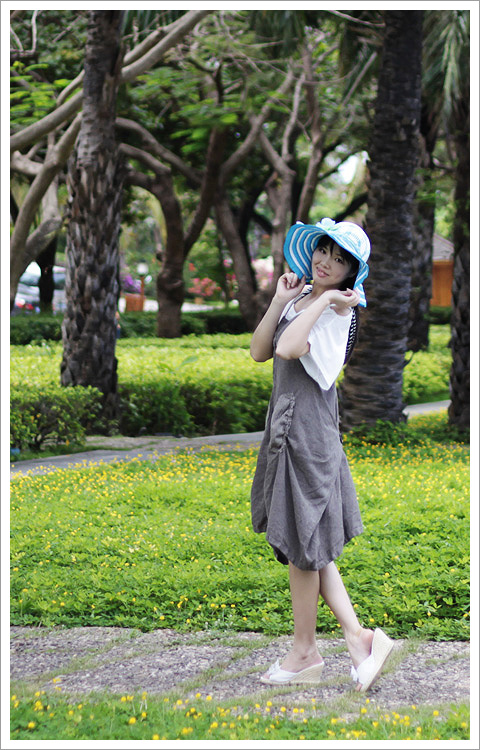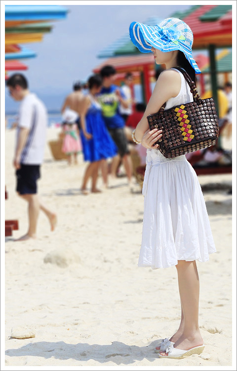 白色棉麻连衣裙+白色编织坡跟凉拖+蓝色编织帽子+椰壳包包