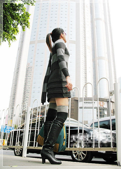 D、条纹带围巾铆钉针织连衣裙+黑色高筒靴+日单机车皮衣+青色皮包