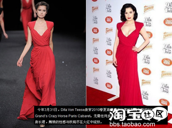 今年3月31日,Dita Von Teese身穿2010春夏高级成衣出席拉斯维加斯的MGM Grand’s Crazy Horse Paris Cabaret。无需任何多余的配饰,一袭带小包肩的Deep V修身长裙,舞娘的性感与妖娆尽在火红中绽放。