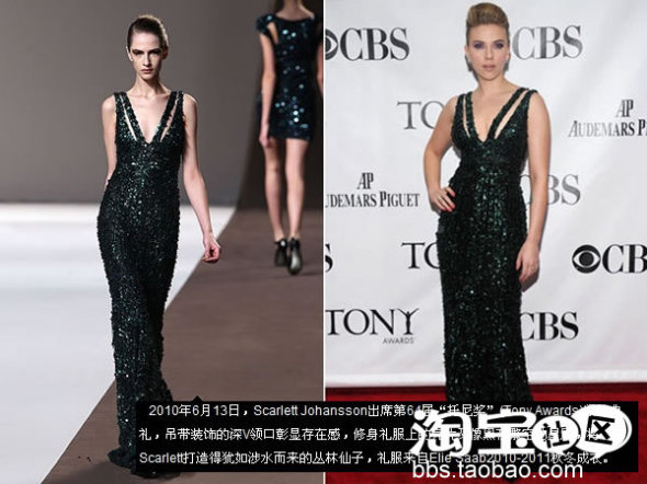 2010年6月13日,Scarlett Johansson出席第64届“托尼奖”(Tony Awards)颁奖典礼,吊带装饰的深V领口彰显存在感,修身礼服上的亮片又像黑夜繁空的星辰,将Scarlett打造得犹如涉水而来的丛林仙子,礼服来自Elie Saab2010-2011秋冬成衣。