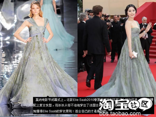 戛纳电影节闭幕式上,这款Elie Saab2010春夏高级定制在款式上稍加改良,帝政高腰配上复古发型,范冰冰从容不迫地穿出了法国古典宫廷感,范冰冰树立的穿衣典范在于她懂得Elie Saab的穿衣原则:适合自己的才是最好的。