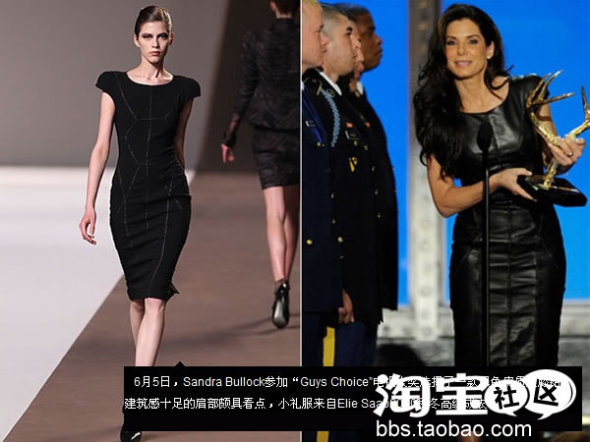 6月5日,Sandra Bullock参加“Guys Choice”电视大奖选择了一款黑色皮质及膝裙,建筑感十足的肩部颇具看点,小礼服来自Elie Saab2010秋冬高级成衣。