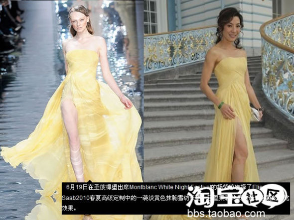 6月19日在圣彼得堡出席Montblanc White Night Festival的杨紫琼选择了Elie Saab2010春夏高级定制中的一袭淡黄色抹胸雪纺长裙,轻盈柔软的质地带来翩跹的视觉效果。