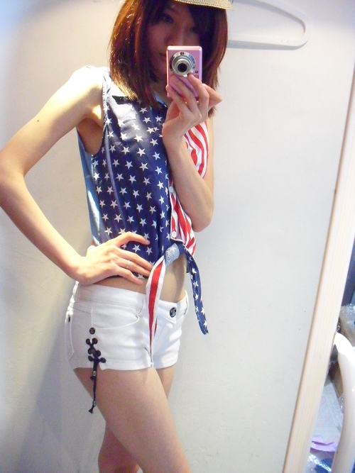 主打风格搭配1:短款无袖系带马甲+白色超短裤