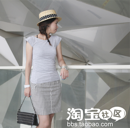 简单设计的灰色T+竖条纹中裙 很大方的一套 大气有职业时尚的着装哦~