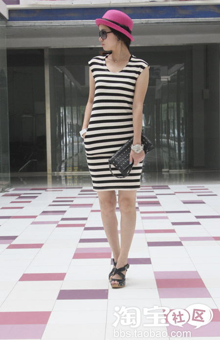 玫红草帽搭配上黑白条纹的针织罗纹修身裙 很显气质哦 一顶彩帽,立刻提亮了整体造型~