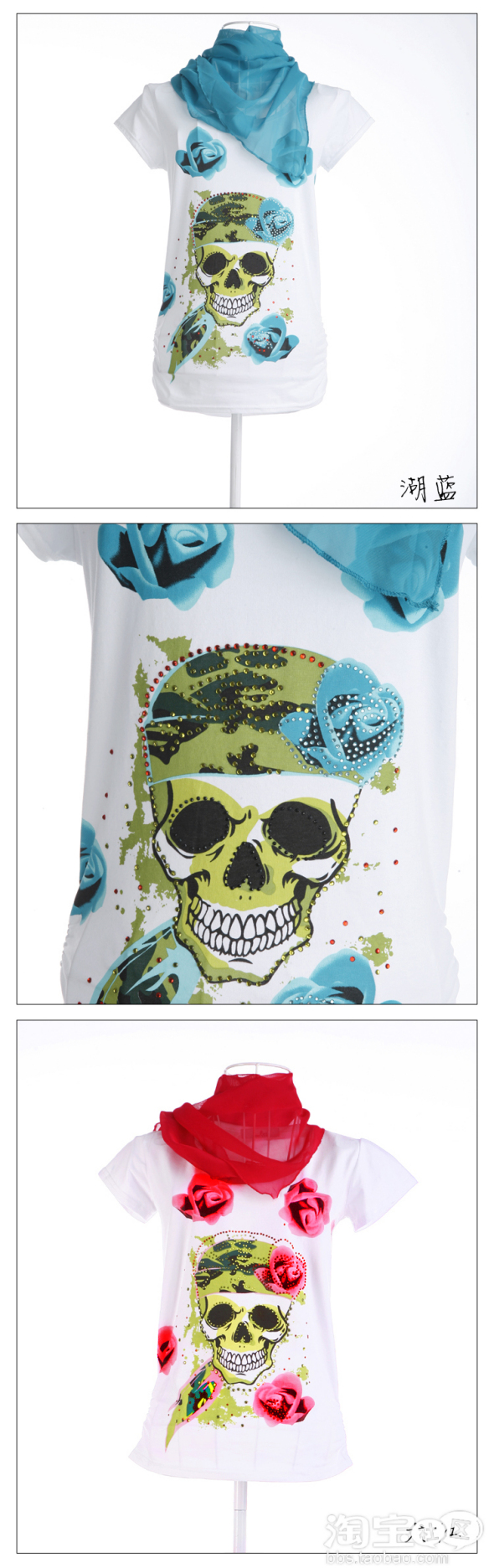 第九款 民族个性玫瑰花闪钻骷髅头短袖T恤(配丝巾)