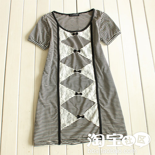 日单条纹蕾丝蝴蝶结连衣裙