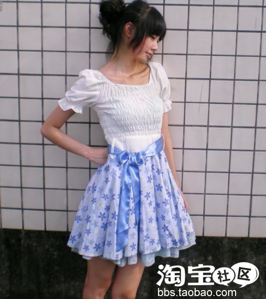 这件裙裙超甜美的,可爱的蝴蝶结、浅蓝色的小花、蕾丝花边等这些时尚元素,绝对有公主范儿