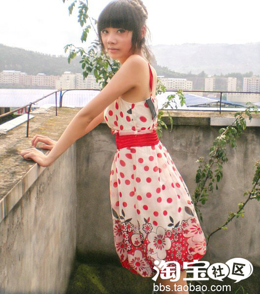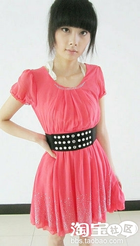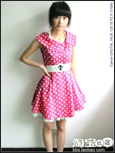 还有这件,走的是当下非常流行的深受MM们喜爱的韩版淑女风,圆点点图案,还有白色腰带束腰,翻领设计,非常可爱,也很显身材。