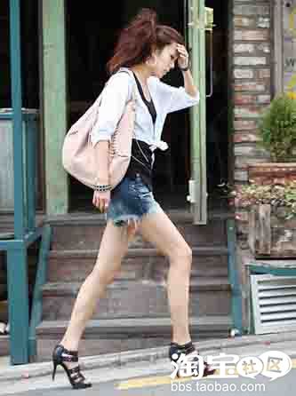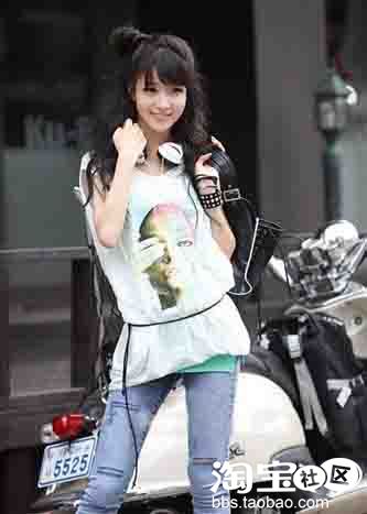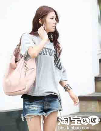 灰色宽T搭配黑色背心,毛边牛仔裤露出修长的双腿^^