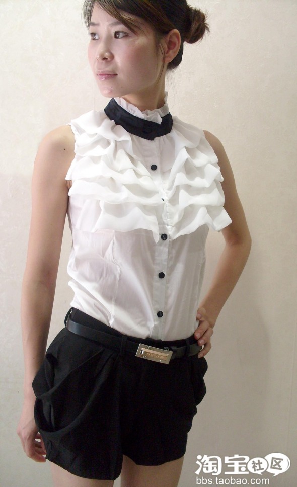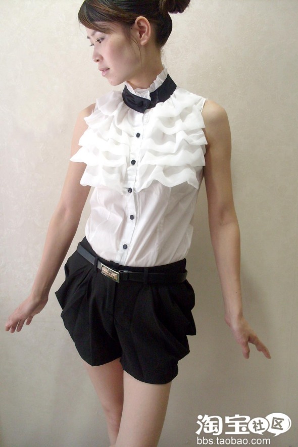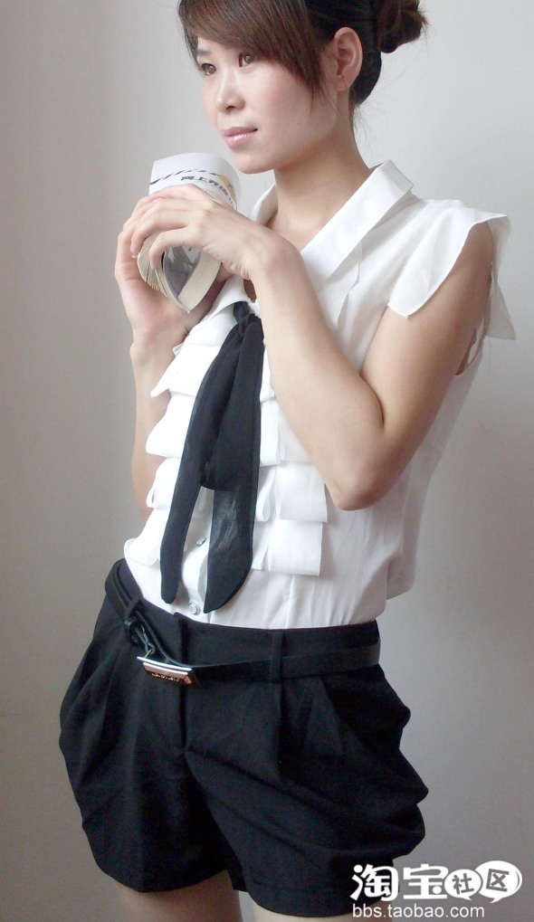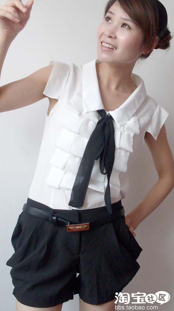 NO.1 翻领白衬衫+黑色灯笼短裤=清爽校园公主