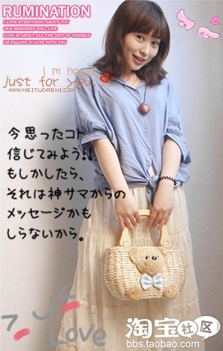 淘宝或者百度打出关键字“田园风”“日本原单”等,都会搜出很多的YY啊,鞋子啊,草编包包啊,小玩意儿啊。