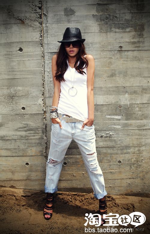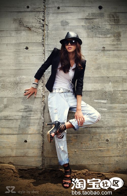 时尚点评:今年大热的糜烂牛仔裤,就是塑造个性帅气造型的不二选择!一件修身剪裁的T恤搭配一条糜烂牛仔裤,就能创造百变的时尚街头造型,配上脚上同样热力十足的罗马斗士鞋,充满punk味道的硬感饰物,你就是街头最亮眼的存在啊!一件女士西装外套可以解决你换装的烦恼,有兴趣也来上那么一条裤子吗?