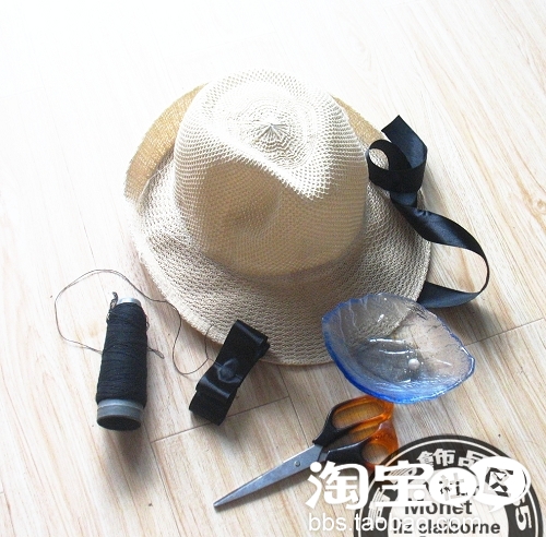 今天要用的工具: 不喜欢的帽子。 丝带 (猪脚) 剪子, 针线,装饰珍珠