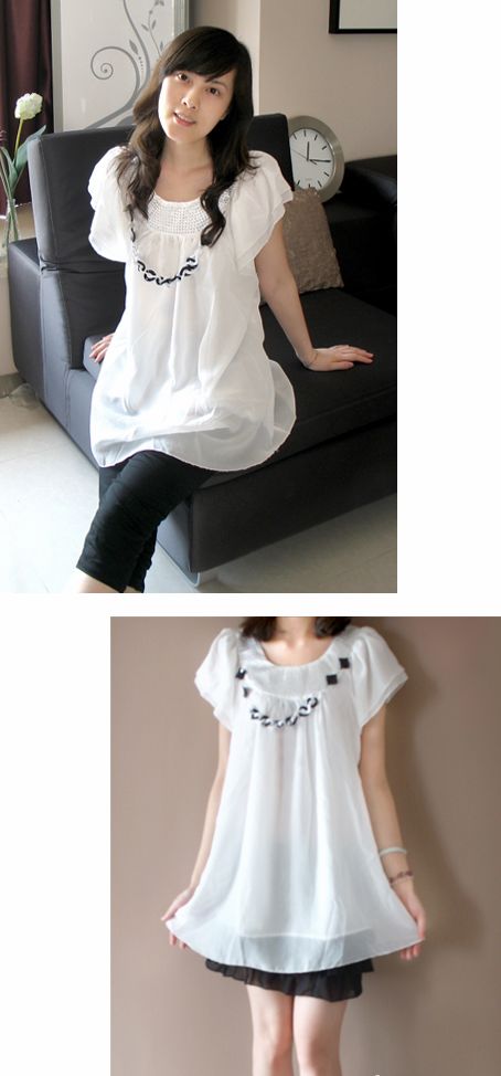 白色雪纺衫此款质量不错!可当上衣穿也可加多一条衬裙,如第二张图片当裙子穿呢!