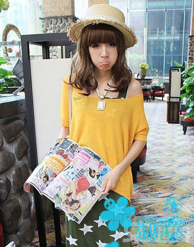这套装扮是典型的氧气美女的混搭法则,明黄色的上衣露出一侧的香肩,纯美无敌,下身的墨绿色的星星图案长裙也比较少见,非常迷人呢。