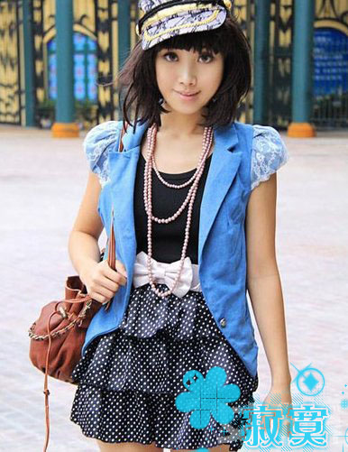 这整身行头可谓是把混搭发挥到极致了,炎炎夏日这样穿可能会有点闷热,不过为了美丽MM们可不会在意这些,牛仔马甲很修身材呢。