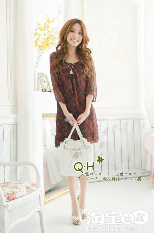 名称:2010时尚加肥加大码★H99831气质柔美 雪紡格紋七分袖洋裝