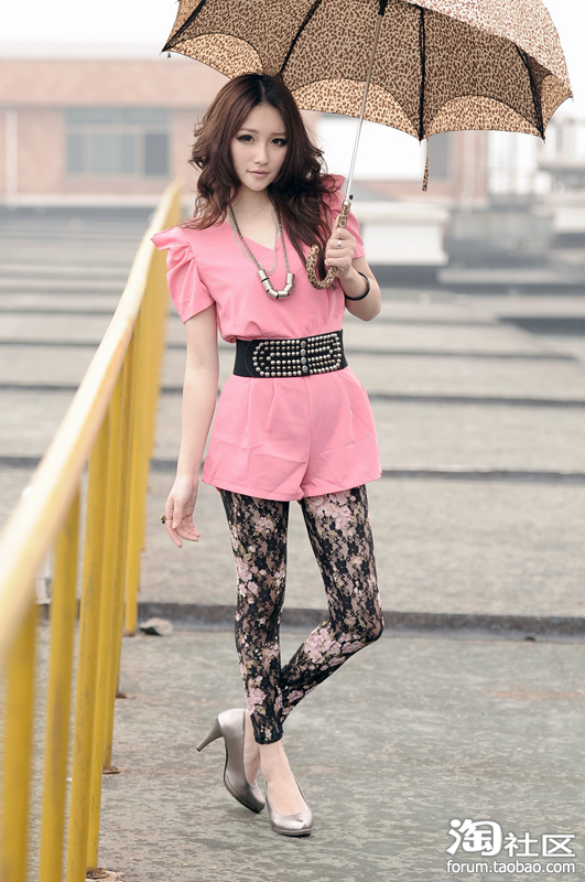 PS:春夏搭配:豹纹伞+桃红连体裤+大花丝袜+铆钉腰带+炫高跟鞋